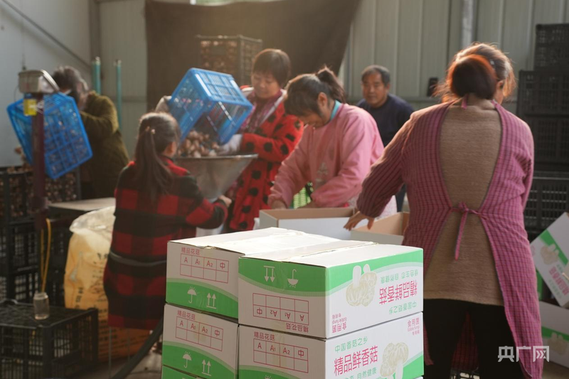 工人们把挑选好的香菇装箱(央广网发 杜福建 摄)