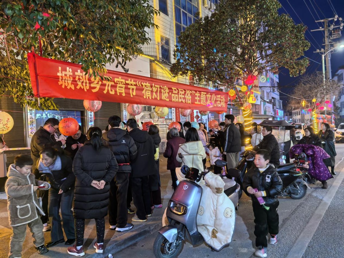 夜幕降临,华灯初上,城郊乡元宵节“猜灯谜·品民俗”主题文化活动现场灯火通明、人声鼎沸。五彩斑斓的灯笼高高挂起,灯笼下方悬挂着涵盖民俗常识、生活百科、益智娱乐等领域的灯谜,既富有趣味性,又具知识性。